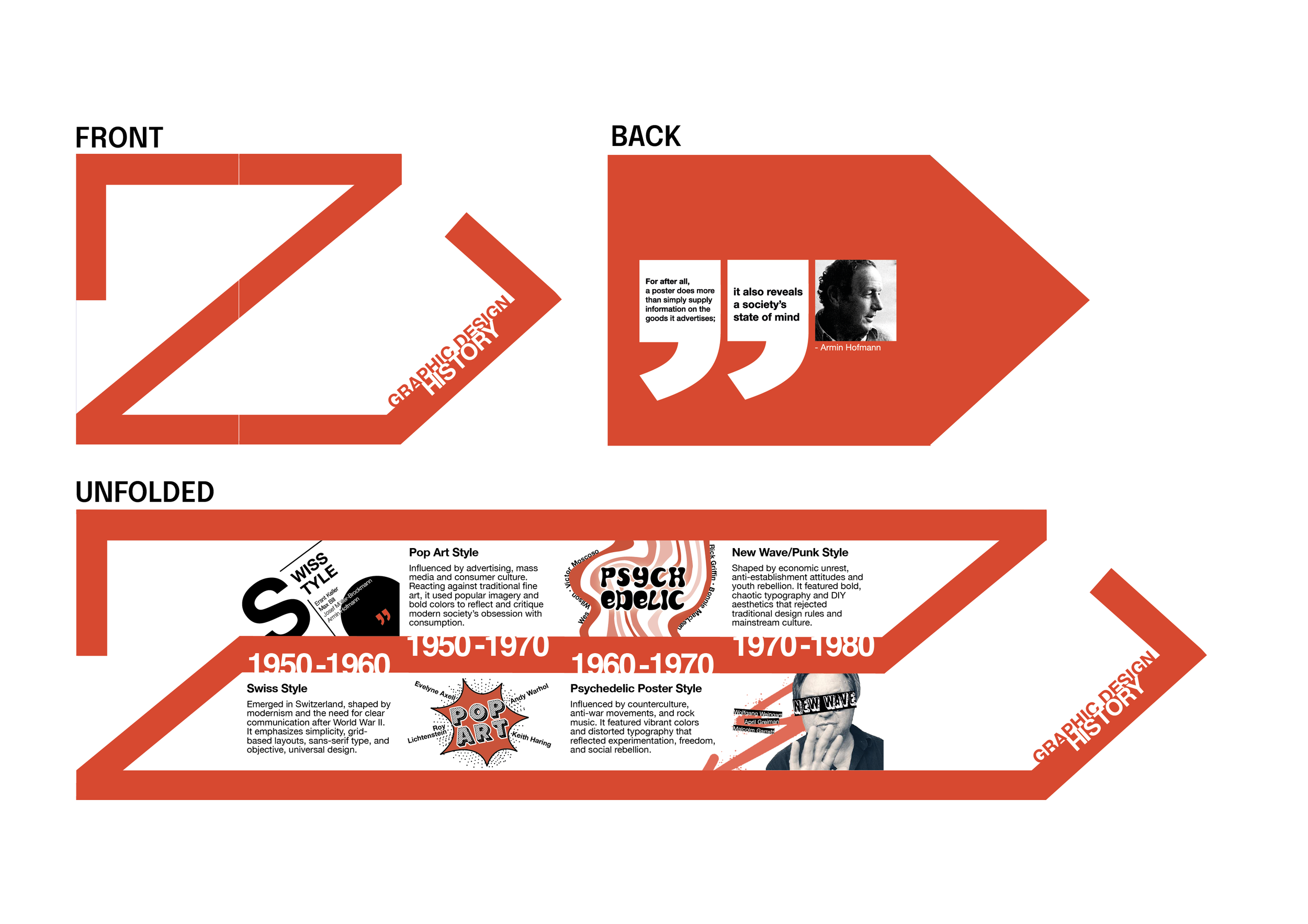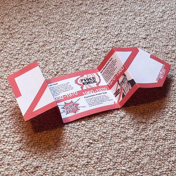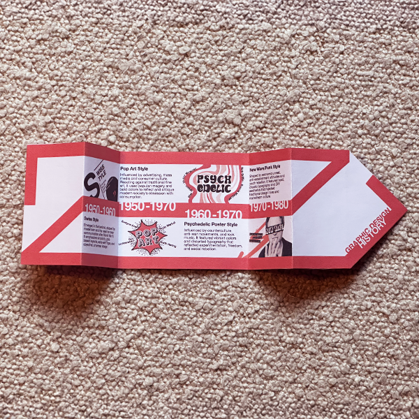 The Noroff Bergen campus is planning a pop-up exhibition to make other students aware of their course and graphic design as a discipline. You need to create a creatively folded leaflet with visually striking graphics that tell the story of four styles in graphic design from 1950 to 1980. You will use your own content to create an engaging timeline or infographic that illustrates the various periods and styles in graphic design.